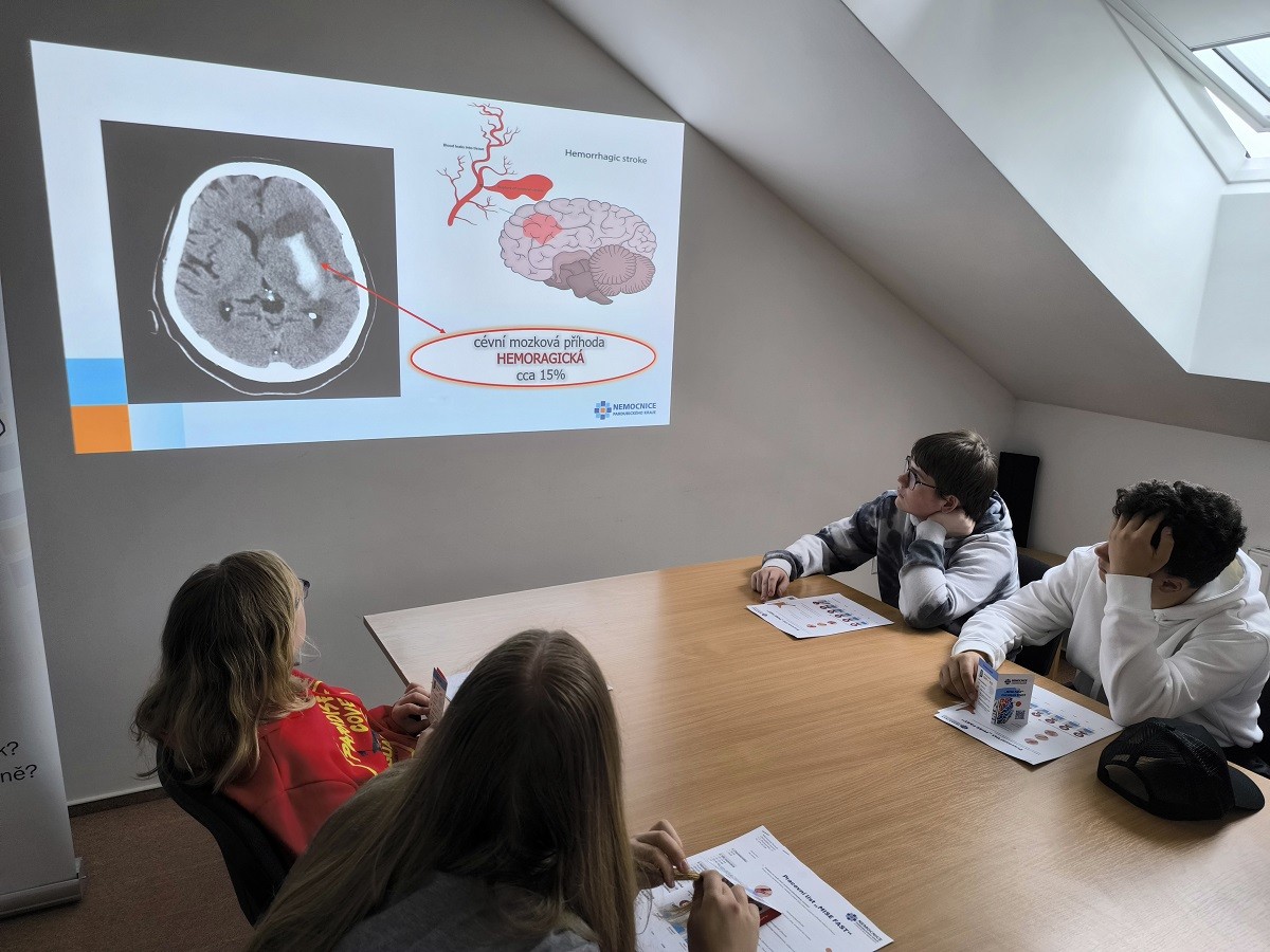 Právě o nich v závěru exkurze povídala žákům lékařka z neurologického oddělení Inna Paťchová: „Nejjednodušší a nejvíce používané schéma pro vyšetření mrtvice je tak zvaný FAST: Face (obličej), Arm (ruka), Speech (mluva) a Time (čas). Když má člověk pokleslý koutek, má poruchu hybnosti poloviny těla nebo jenom jedné končetiny, začíná špatně mluvit, nedokáže se vyjádřit, má setřelou řeč nebo má náhle vzniklé motání hlavy s poruchou rovnováhy, případně padá, má dvojité vidění, rozostření zraku, tak to znamená, že se v mozku něco děje a je čas volat záchranku. I když tyto příznaky trvají pouze několik minut a pak kompletně odezní, stejně je nutné zavolat záchranku, protože se může jednat o tranzitorní ischemickou ataku – přechodnou krátkodobou mrtvici, která může být předzvěstí velké mozkové příhody s trvalými následky.“