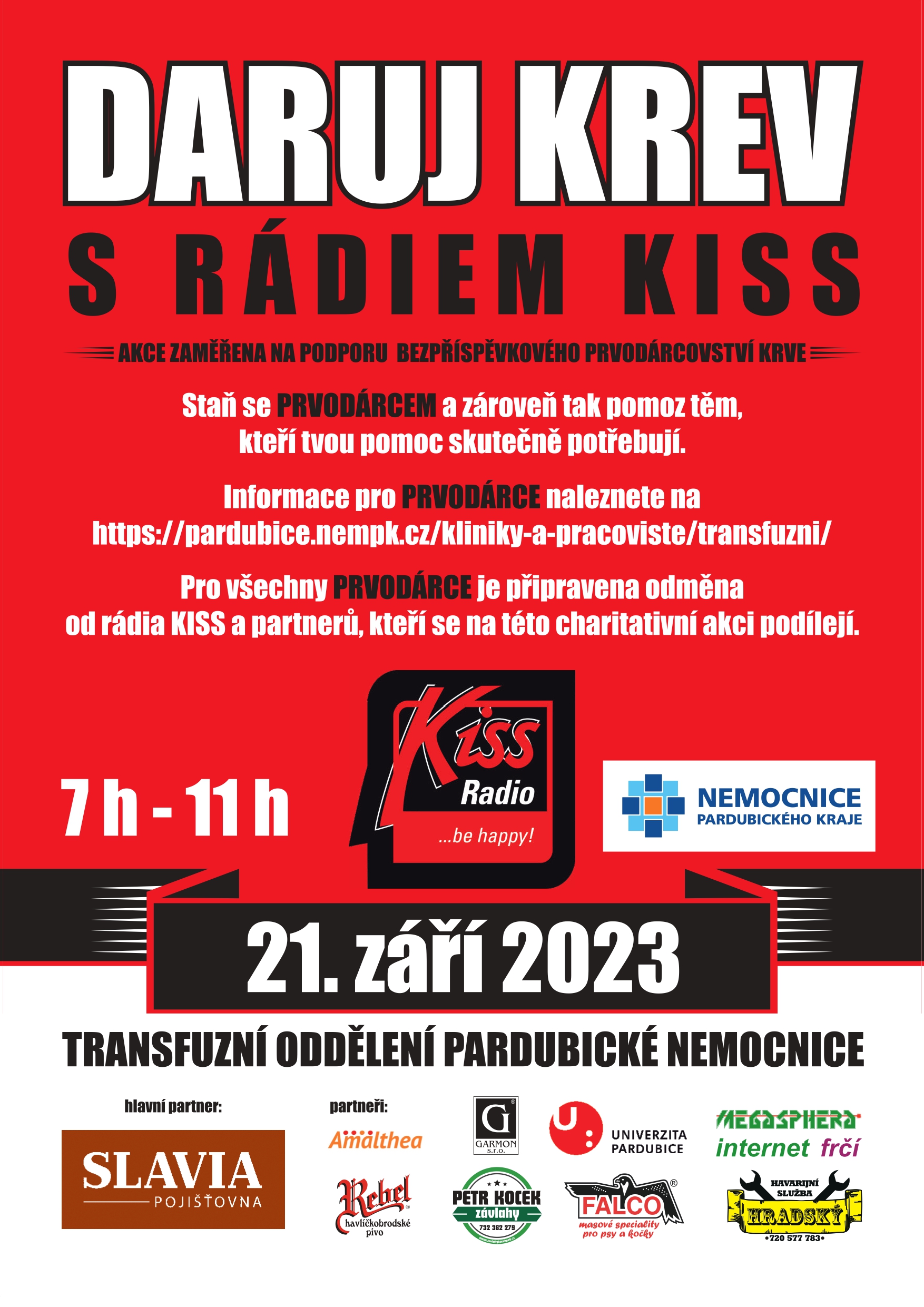 Staňte se prvodárcem a přijďte bezplatně darovat krev ve čtvrtek 21. 9. 2023 od 7 do 11 hodin na transfuzní oddělení Pardubické nemocnice.